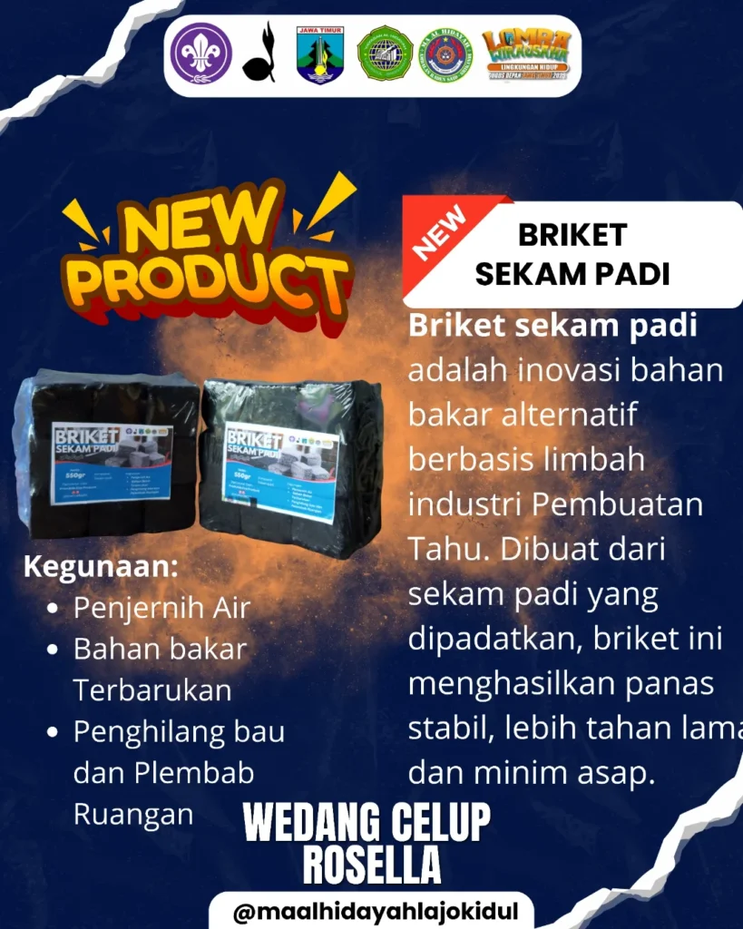 Briket sekam padi merupakan produk ramah lingkungan yang dihasilkan dari pemanfaatan limbah sekam padi. Sekam yang biasanya hanya dibuang atau dibakar, kini diolah menjadi bahan bakar alternatif dengan daya nyala cukup lama dan lebih hemat. Selain itu, produk ini juga berkontribusi dalam mengurangi pencemaran lingkungan akibat limbah pertanian.